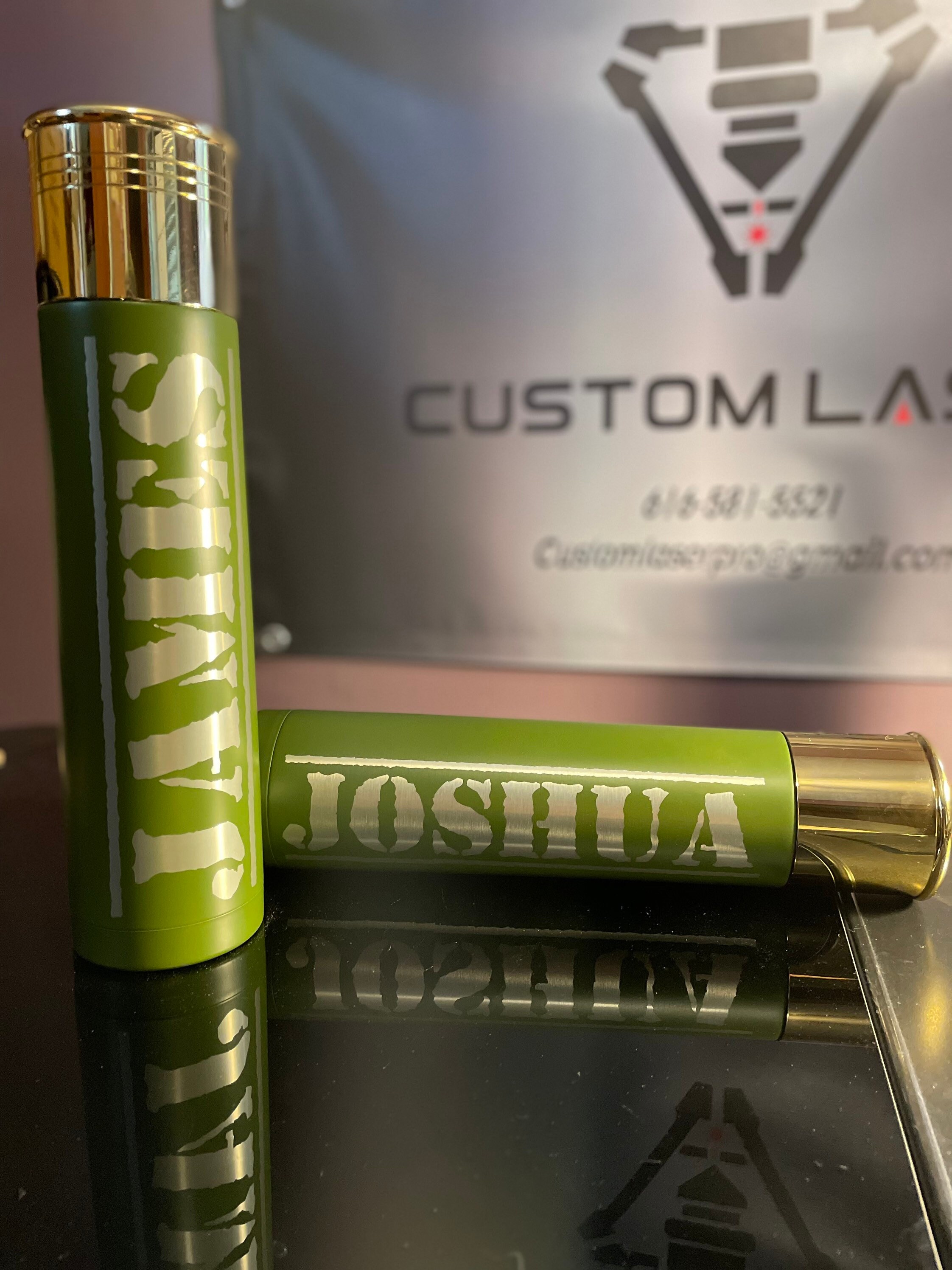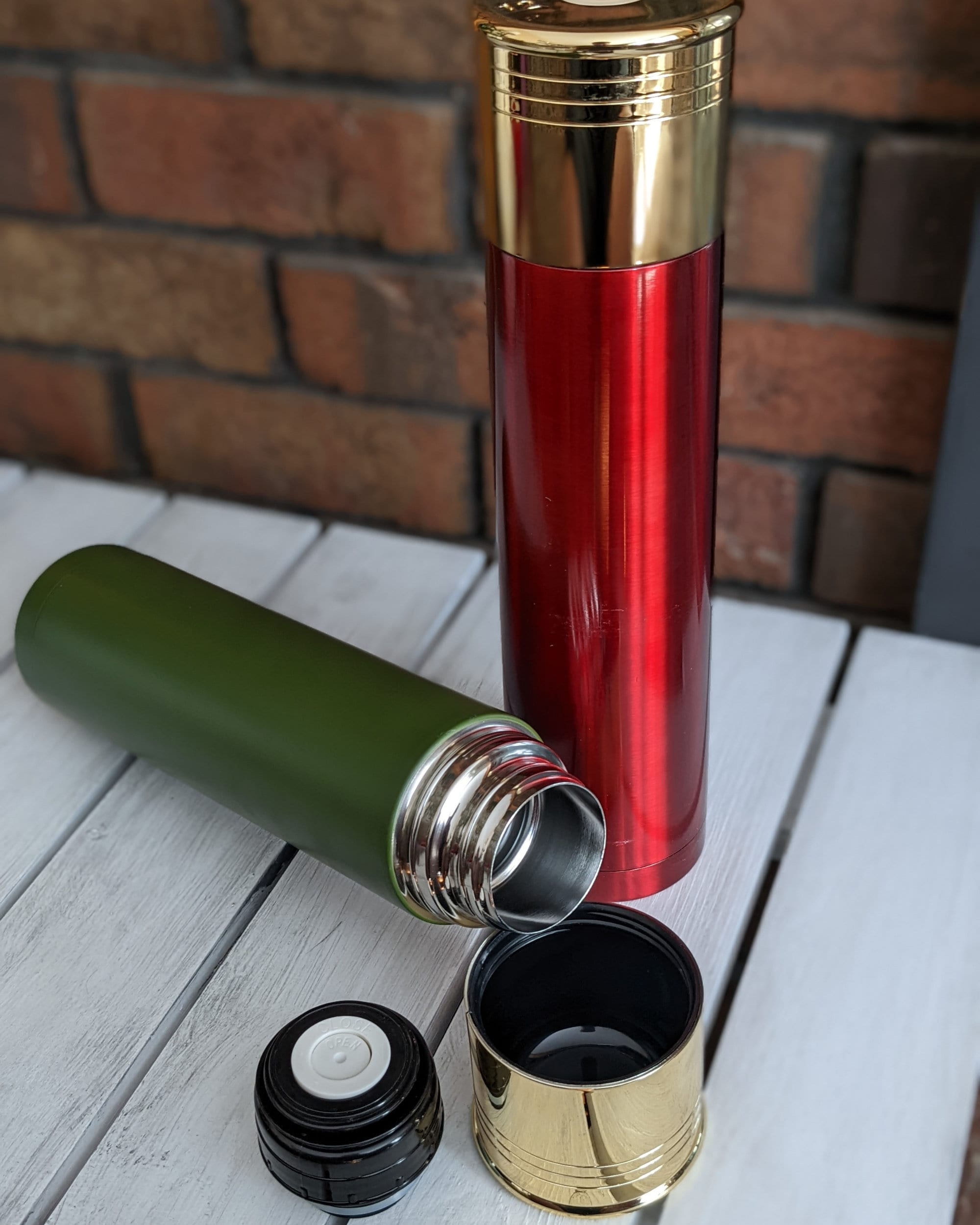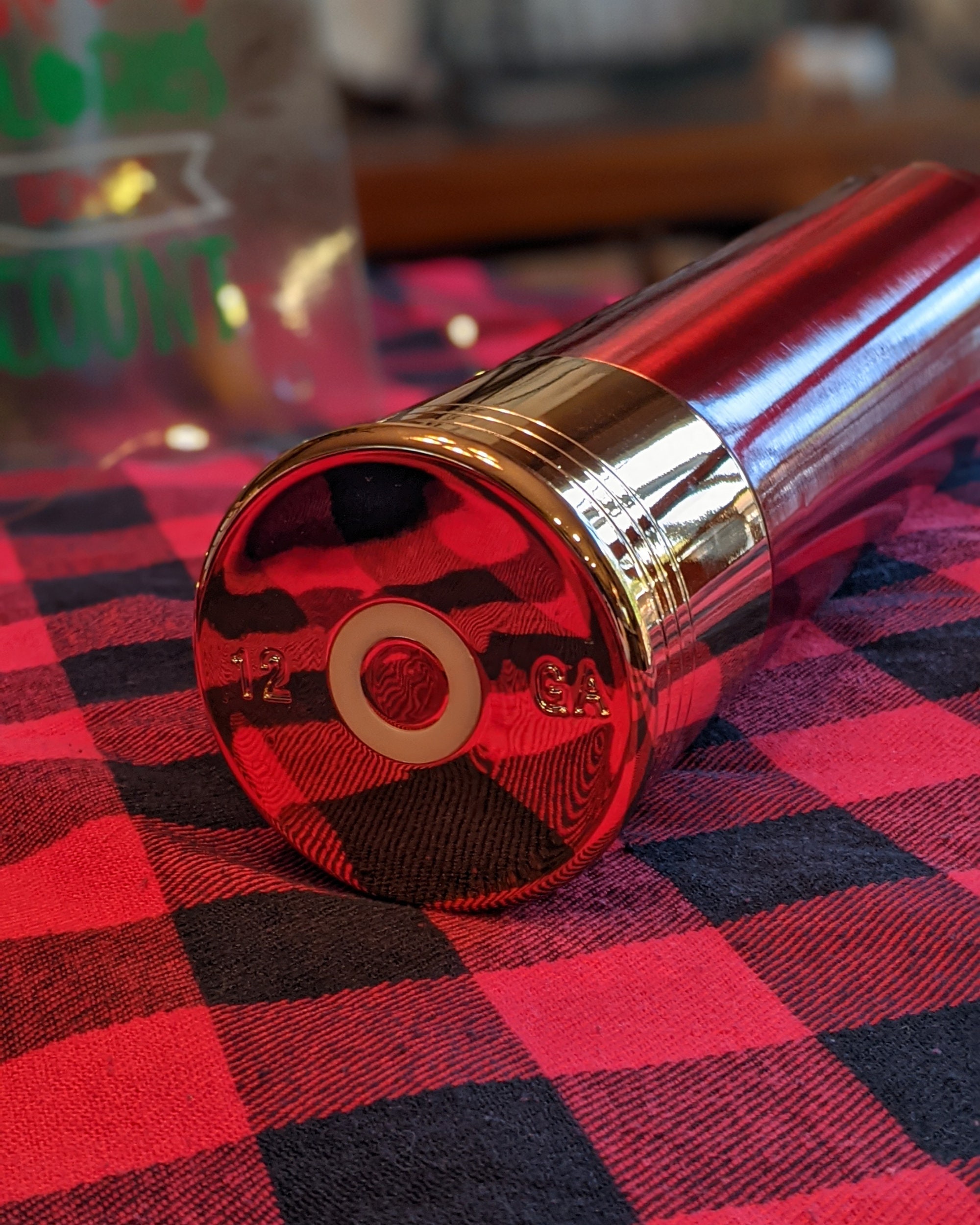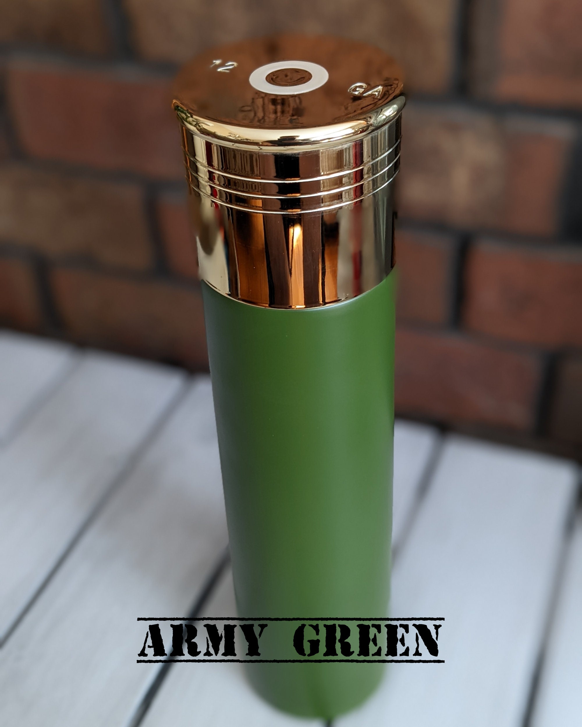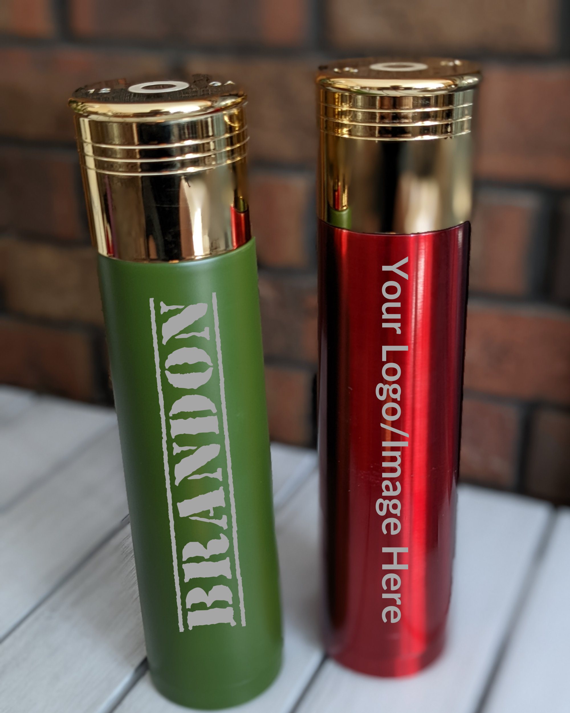 These 12 Gauge Shotgun Shell Bullet Thermos Tumblers are double wall, vacuum insulated to keep your colds colder and your hots hotter for longer. They hold 32 ounces.