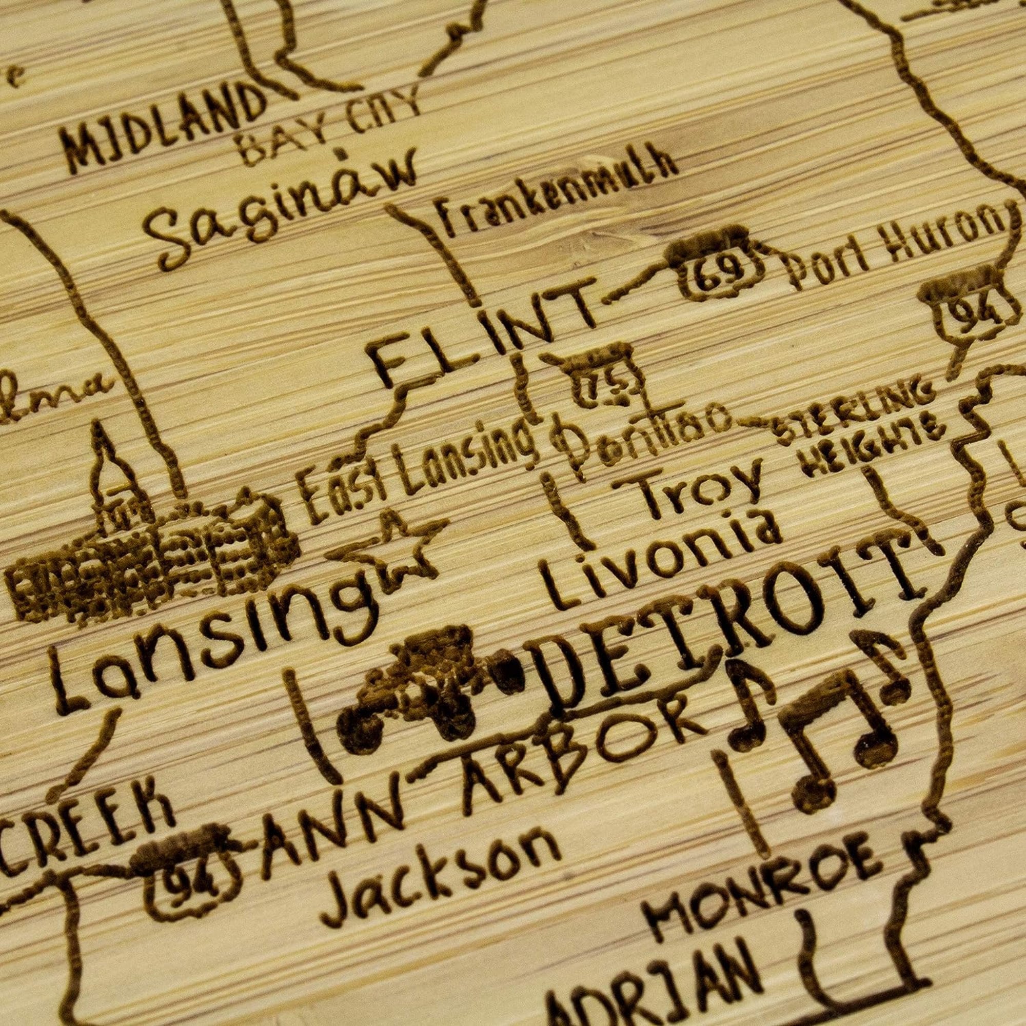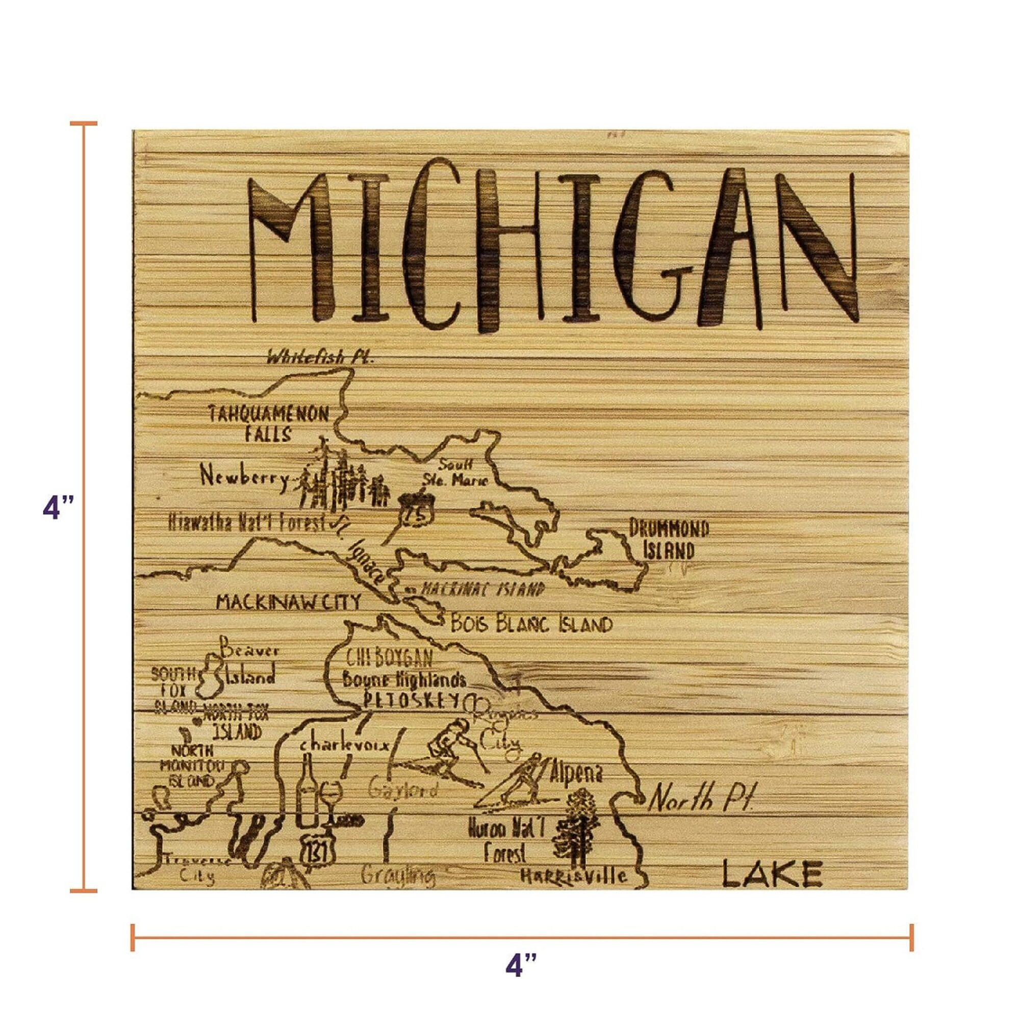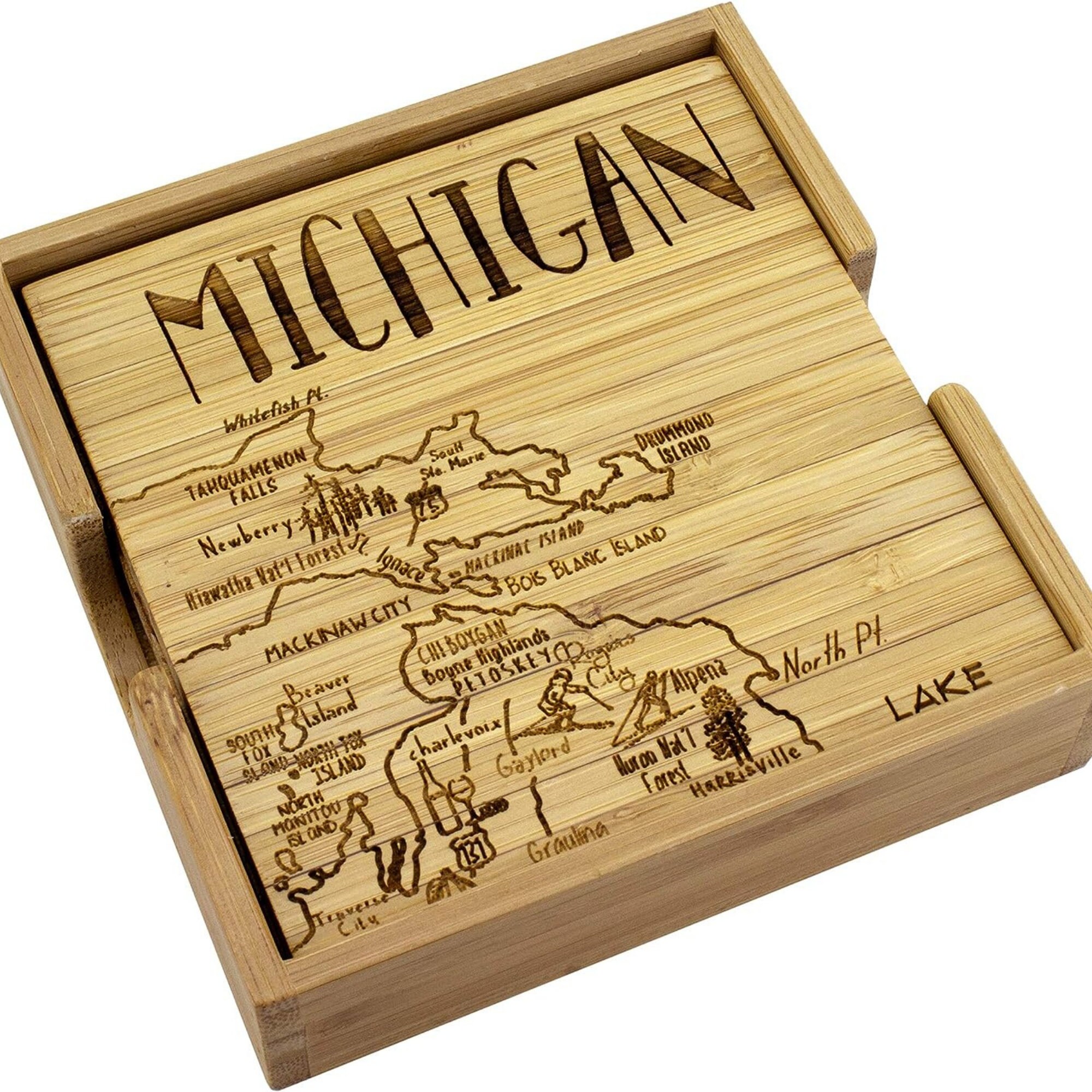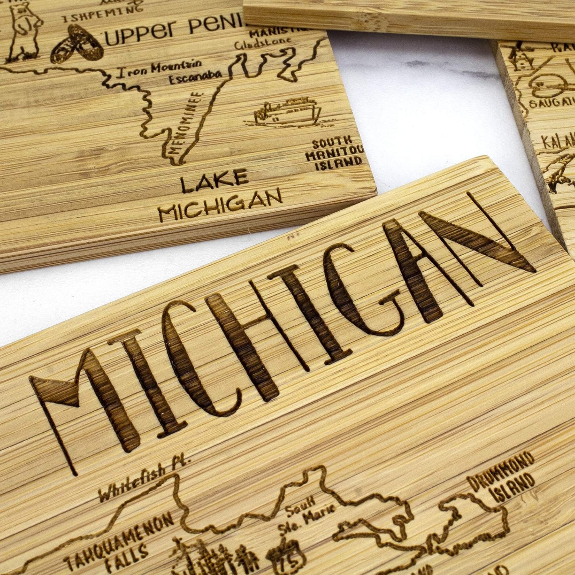 Michigan State Puzzle 4 Piece Bamboo Coaster Set with Case 4"x4" Fun Coaster set with holder. Create the beautiful state of Michigan with this 4 count coaster set. Beautifully engraved to last a lifetime.